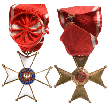 Officer's Cross, 4th Class, instituted in 1921. Breast Badge, 45 mm, gilt Silver, enameled, both central medallions gilt Silver, original suspension ring and ribbon with rosette. I