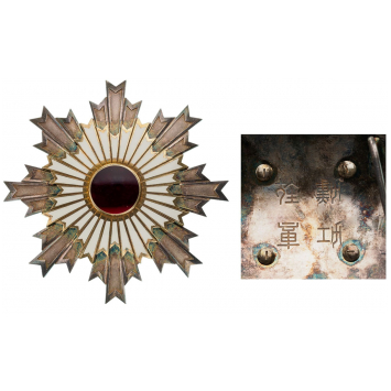 Grand Cross`s Star instituted in 1875. Breast Star, 91 mm, partially gilt Silver, obverse enameled, reverse with Japanese inscriptions, superimposed parts silver gilt, enameled, reverse with triple vertical pin. A superb star, in mint condition! I