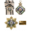 Grand Cross Set for Ladies, 1st Model, Civil, instituted in 1935. Sash Badge, 70x52 mm, gilt Silver, one side enameled, original suspension ring and complete sash with bow for ladies. Breast Star, 87 mm., gilt Silver, maker`s mark "BW, Heinrich Weiss, Bucarest", hallmarked "88-66, crown", cross pattee with convex edges and curved arms (sometimes called an "Alisee" cross), white enamel and a black enameled stripe near the sides of the cross, blue enameled legend "Nihil Sine Deo", surrounded by a wreath of laurel leaves (left side) and oak leaves (right side), white-enameled central medallion with black Romanian eagle with the Hohenzollern coat of arms on a shield on the eagle`s chest, on the reverse medium pin. Extremely rare set for Ladies, in mint condition! I RR!