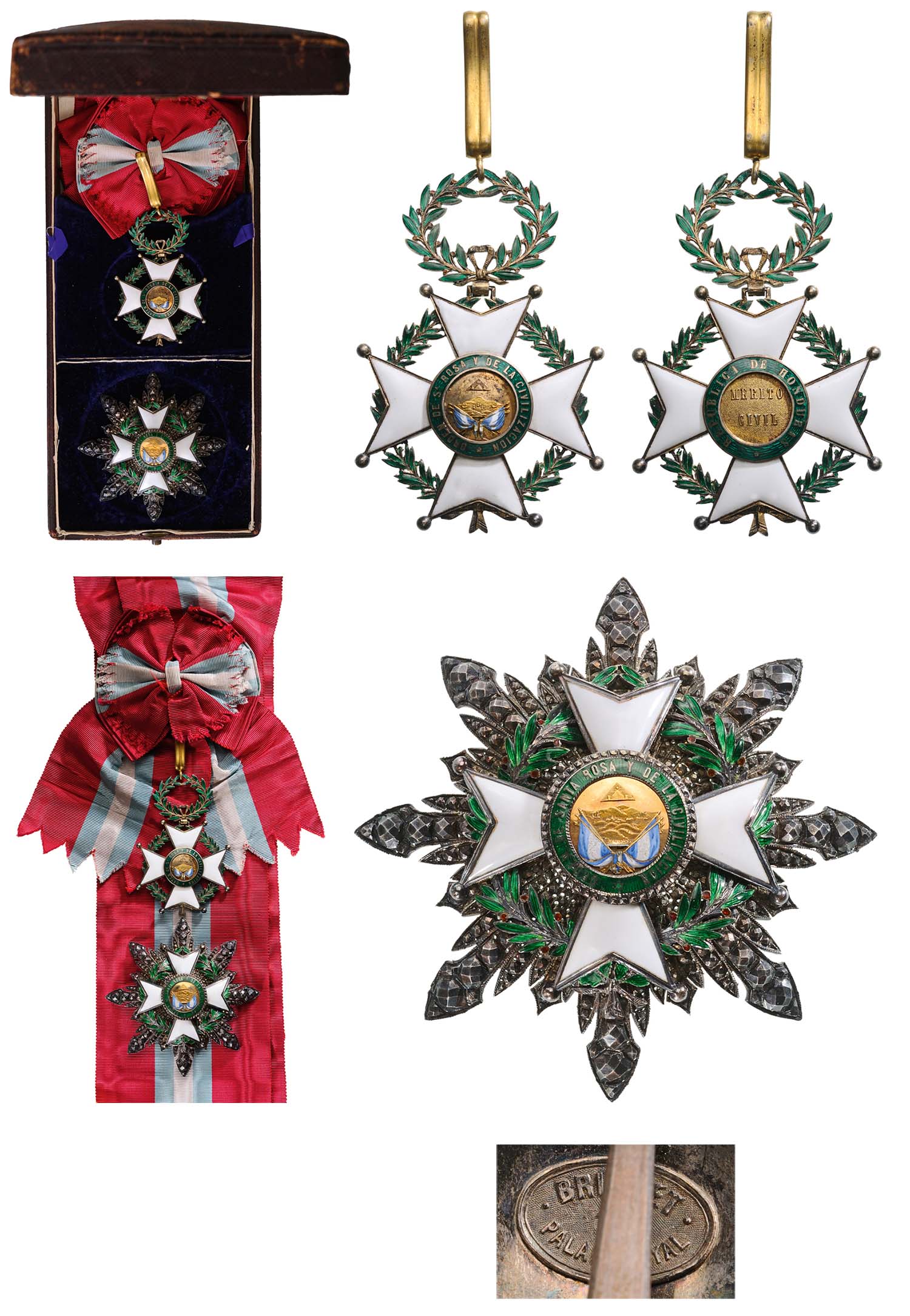 Grand Cross Set, 1st Class, instituted in 1922. Sash Badge, 89x62 mm, Silver, enameled, original suspension ring and long complete sash. Breast Star, 98 mm, Silver, maker`s mark "Briquet - Paris", superimposed parts enameled, center medallion silver gilt, on reverse large pin and two side hooks. In original case of issue by "Pouteau Fayolle - Paris". An extremely rare set of high French jeweler`s quality manufacture, in extremely fine condition! I-/I RR!