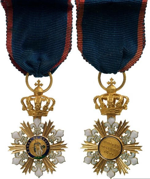 Knight’s badge of the Order of reduced size, 36x22 mm, in GOLD as a 6pointed star of polished rays, flanked by white enameled fleur de lys; obverse centre medallion with the polychrome enameled image of the saint wearing royal robe on “frosted”, golden background; blue enameled outer circlet bearing the motto “FIDEI ET MERITO” in golden lettering; upper, royal crown, fitted with grooved suspension ring; reverse centre medallion in gold with embossed inscription “FERD.IV