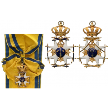 Grand Cross Badge of the Order. Sash Badge, 81x54 mm., GOLD, as an oblique, white enameled cross of Maltese type with ball-finials, flanked by finely embossed crowns with enameled details, one sword with golden hilt and blue enameled blade to each side and, on top and below, two crossed swords, also with golden hilt and blue enameled blade, all “tied” to the cross itself by a golden ribbon, made of Gold-strip, blue enameled obverse centre medallion with a sword pointing upwards, within Sweden’s “three crowns”, reverse centre medallion also blue enameled, bearing a laureated sword pointing upwards and the motto “PRO PATRIA” running above, elaborate loop, composed of embossed rocailles, to which a crown of Royal type is hinged, enriched of enameled “jewels”, strong, round ring through the crown’s orb and typical ring to mount the cross to its original sash ribbon.