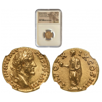 ANTONINVS AVG PIUS PP IMP II, laureate head of Antoninus right / TR POT XIX COS IIII, Antoninus togate standing left, holding globe and volumen. RIC III 256a. Cal. 1673. A splendid coin in Mint State, slabbed NGC MS, 5/5, 4/5. UNC.