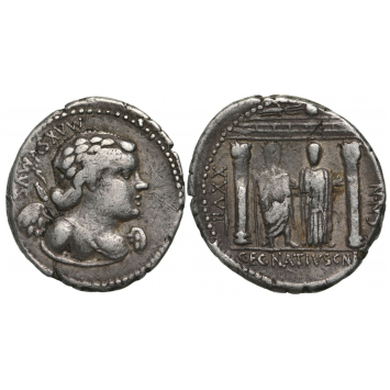 MAXSVMVS. , Bust of Cupid right, with bow and quiver over shoulder/ XXVIIII / C EGNATIVS CN / CN N. Distyle temple, containing Jupiter and Libertas standing facing. Crawford 391/2.VF+, superb patina!