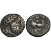 Stylized head of Zeus with laurel wreath to the right/ Stylized horseman to the right, triskeles below, remains of legends in the fields. Dembski: 1352 Göbl (OTA): 434. XF/VF+