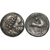 Stylized head of Zeus with laurel wreath to the right/ Stylized horseman to the right, triskeles below, remains of legends in the fields. Dembski: 1352 Göbl (OTA): 434. XF+