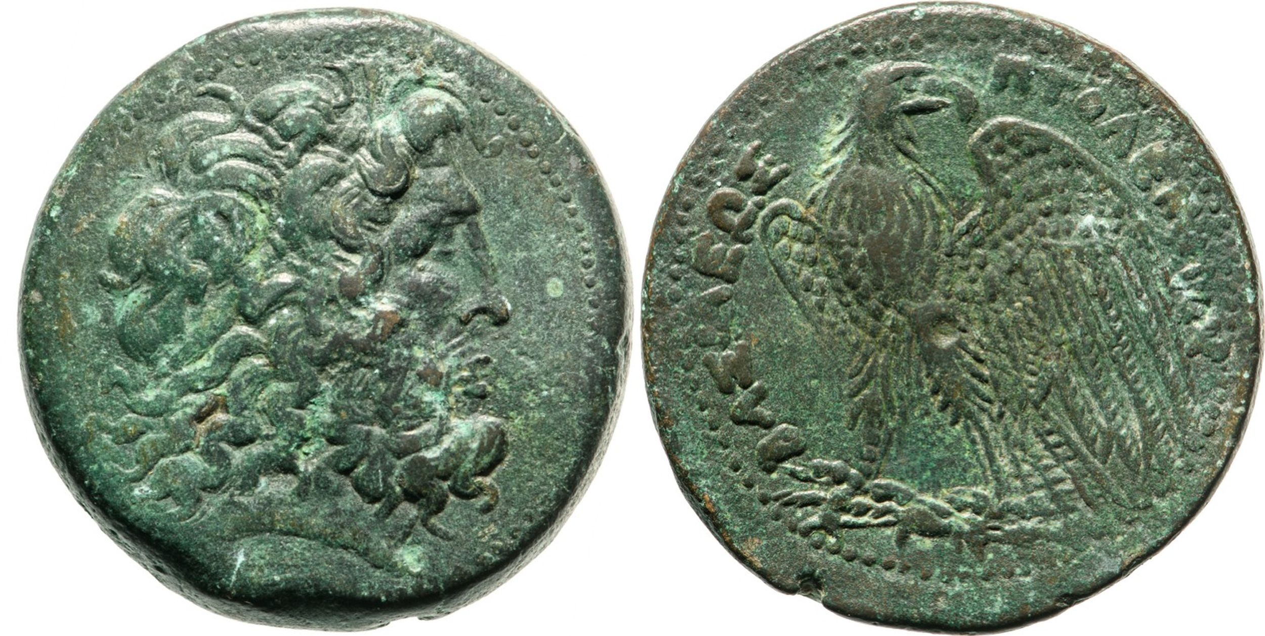 Head of Zeus-Ammon right wearing tainia/ Eagle with spread wings standing left on thunderbolt, head right. Svoronos 412 (Ptolemy II), SNG Copenhagen 141 (Ptolemy II). VF+, superb green patina!