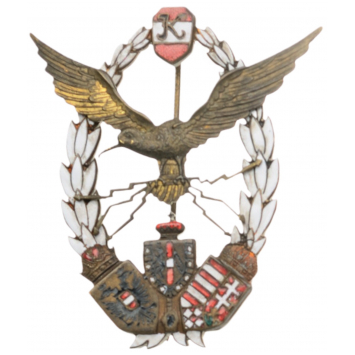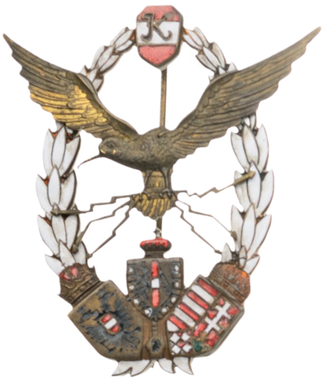 Breast Badge, 68x60 mm, Gilt tombac, partly enameled, separately applied albatross patinated, with lightning bolts, RS Albatros embossed semi-hollow with tin bertical pin on reverse. Maker`s mark "J. ZIMELER WIEN.VII.". I