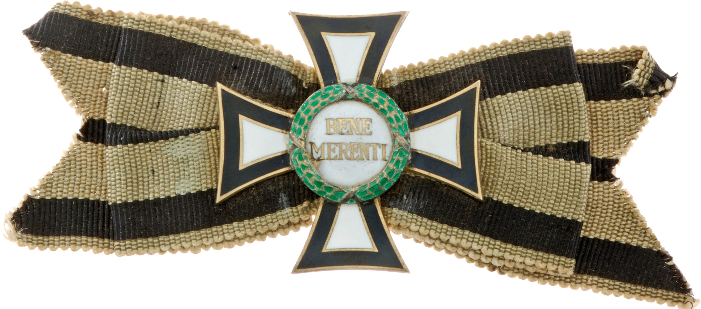 2nd Class for Ladies, 30 mm in gilt Silver, enameled, reverse with thin pin. Silver gilt Leopold Cross, enameled, plain on reverse, thin pin back and original ribbon. In the center the inscription "Bene Merenti". A charming and extremely rare order in extremely fine condition! I RR!