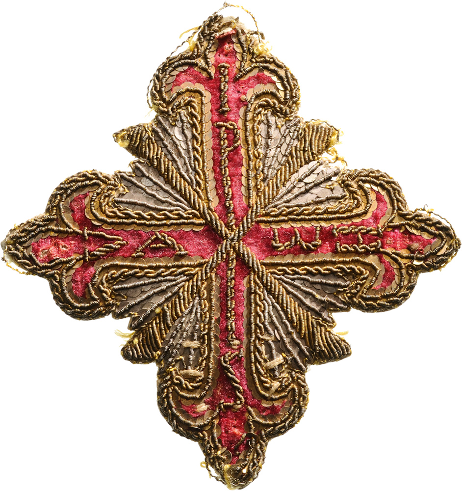 Embroidered, Commander`s Star, 83 mm, in GOLD bullion-wire and sequined rays, centre cross in red velvet with gold-embroidered, red letters, white sheepskin reverse with tin-plated iron fastening clip. A very rare, early star, dating from the late 18th or the earliest 19th Century.Very fine condition. II RR!