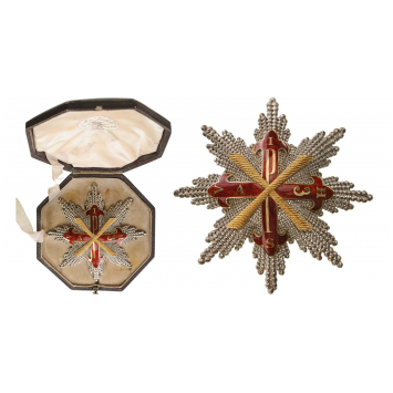 Breast Star of the order, 74.5 mm, chiseled and pierced rays, the centre in gold with excellent chisel work under the red, translucent enamel, the reverse with white lambskin and vertical, broad pin, in the original, fitted, octagonal case, with maker`s label of Josef Leibold, Vienna. A magnificent star. Provenance: The estate of Graf Moritz von Dietrichstein-Proskau-Leslie. A very rare star in the finest Viennese quality, excellent condition. I RR!