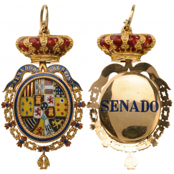 Gold Insignia of Member of the Senate, 49x40 mm, oval, with the coat-of-arms of Spain, within blue-filleted frame of gold with chiseled details, the whole, enclosed within the collar of the Order of the Golden Fleece and blue enameled ribands above, with the golden inscription"SENADOR DEL REINO", convex, polished reverse, with the blue enameled inscription "SENADO", upper crown also made of gold, with enameled details, round, suspension ring. A beautiful insignia of finest manufacture, dating to the 2nd half of 19th Century, excellent condition.I RR!