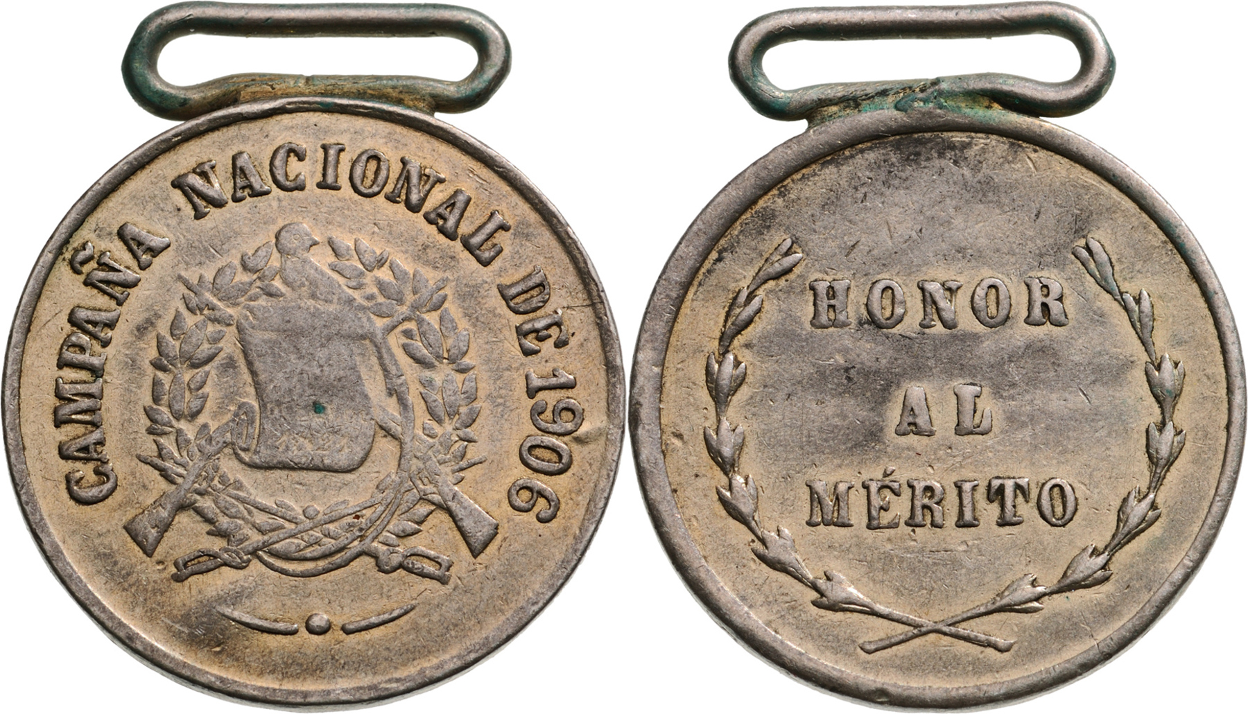 Breast Badge, 27 mm, Silver, original suspension ring. In June 1906, El Salvador and Honduras declared war on Guatemala and El Salvador`s former President General Tomas Regalado, led a Salvadorian invasion of Guatemala but is said to have gone into battle whilst drunk and suffered serious wounds of which he died at Yupiltepeque near the Salvadorian border on 11 June 1906. The campaign lasted just eight days, the invasion being repulsed. Very rare ! II RR!