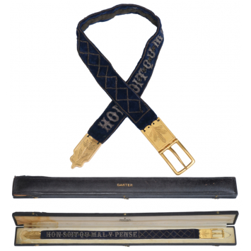 An early, embroidered Garter, 55 cm. "HON SOIT QU MAL Y PENSE", in gold wire and sequines, gilt Bronze closings, in original case of issue, 605x57 mm., by "Garrard&Co. Ltd, London", with gilt inscription on the lid. A rare set, of high quality, in very fine condition! I- R!