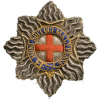 An early embroidered mantle Star to a Knight of the Order, 230x240 mm, the rays of silver wire and sequines, the centre with thin, red woolen cross within thick silver embroidery, the outer circlet made as a tied garter with the Order`s motto "HONI SOIT QUI MAL Y PENSE" on soft, blue velvet ground, the reverse with original paper backing. A very fine and very early star, from the late XVIII early XIX Century, extremely fine condition and of high rarity! I- RR!