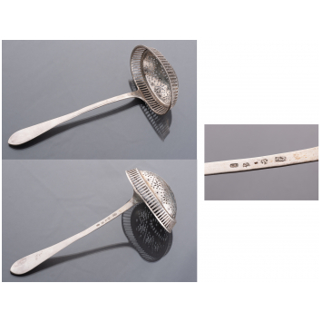 Openwork sugar spoon in silver, model with gallery border and flat spatula. Work late nineteenth from Central Europe, four unindentified hallmarks. Length 16.5 cm, weight 43 g. Good condition.