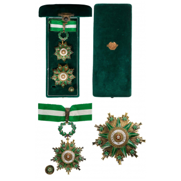 Grand Officer`s Set, Republic, instituted in 1893. Neck Badge, 95 x 63 mm., gilt Silver, multipart constriction, superimposed parts enameled, central medalion enameled, original suspension device and ribbon. Breast Star, 76 mm, gilt Silver, multipart constriction, superimposed parts enameled, central medalion enameled, with vertical pin on the back. Together with enameled lapel hole rosette, in orginal case of issue by "Frederico Costa, Lisboa" with gilt coat of arms on the lid. A splendid and rare set! I R!