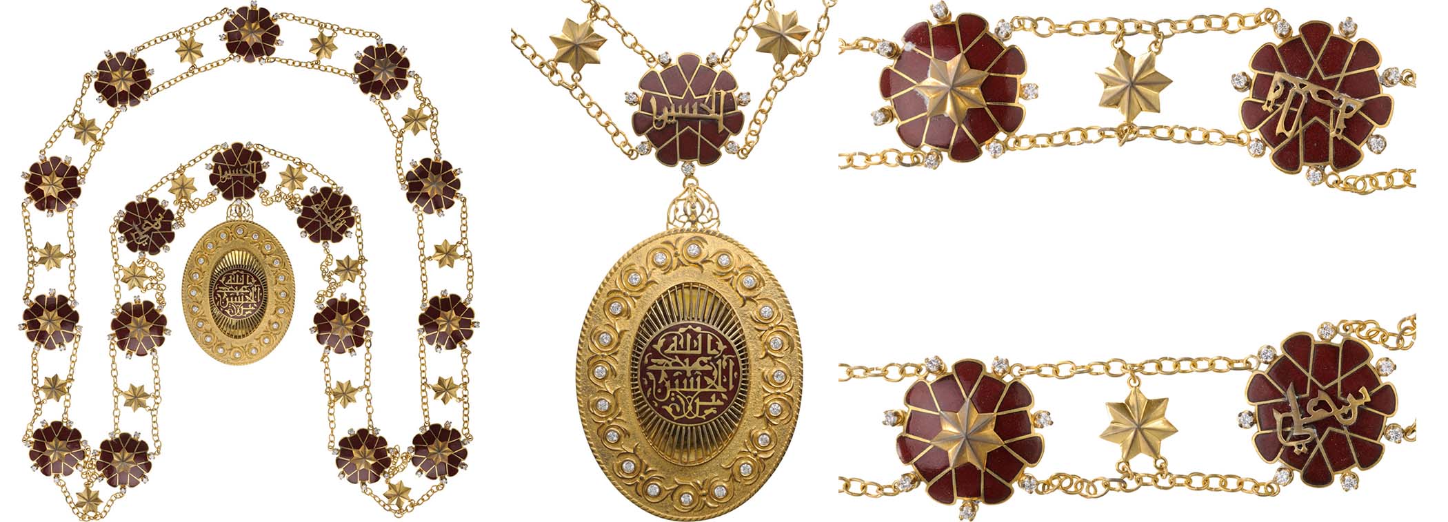 Collar of the Order in gilt Silver: 17 golden, red enameled stylized roses, flanked by seven diamond-cut pastes each, 13 of them centered by six-pointed stars, the three towards the badge, super imposed by a calligraphic, arabic inscription meaning "Qiladat al-Hussein bin-Ali" or "The Collar of Hussein bin-Ali", 16 golden, six-pointed stars, all linked by thin golden chains, oval badge, with red enameled centre medallion bearing the arabic inscription "Hussein bin-Ali" surrounded by pierced, thin golden beams, within broad border set with 20 diamond-cut pastes in a pattern of stylized foliage, decorated, pierced, upper suspension. An extremely rare Collar of the order, instituted on June 22nd, 1949, reserved to the sovereign