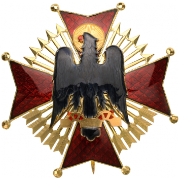 Grand Cross Star in GOLD, instituted in 1944. Breast Star, 73 mm, GOLD, 60 g., multipart construction, superimposed part Gold, enameled, reverse with long vertical ornamented pin and two side hooks. Superb and rare star of best Spanish jeweler`s quality! I R!