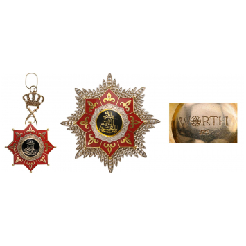 Grand Cordon Set. Sash Badge 57 mm, in gilt Silver, enameled, with crown and crossed swords suspension, reverse maker`s mark "Worth", hallmarked "925". Breast Star, 79 mm in gilt Silver, enameled, maker`s mark "Worth", hallmarked "925". An extremely rare set awarded to high ranking officers! I RR!