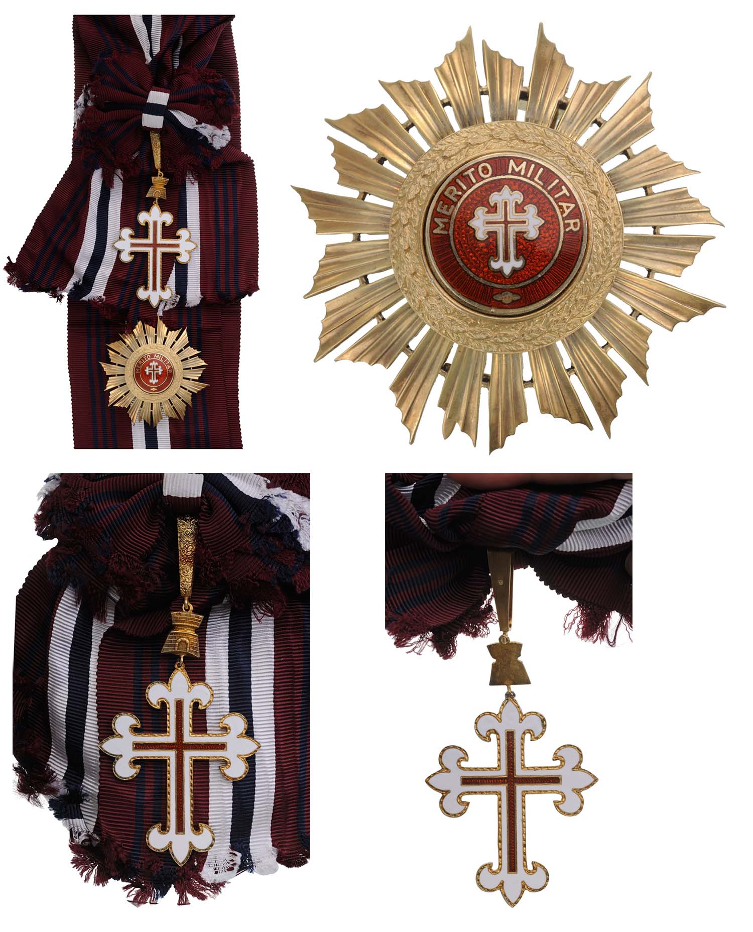 Grand Cross Set. Sash Badge, 90x55 mm, gilt Silver, central medallions gilt silver, hallmarked, enameled, original suspension device and loop, complete sash. Breast Star, 73 mm, gilt Silver, hallmarked, central medalion enameled, vertical pin on reverse. I