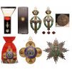 Complete Grand Cross Set:- large Order`s Badge, 117x98 mm, in gilt Silver with black 2 enameled double eagles (symbol of the Greek Orthodox Church) and two crowns with red enameled inner cap (representing the Eternal Kingdom of Faith) on each side, obverse centre medallion with finest, polychrome, miniature painting with the image of the Holy Sepulchre in Jerusalem, blue enameled outer circlet with gilt Greek inscription "IN THIS SIGN YOU WILL WIN " and "JERUSALEM MOTHER OFTHE CHURCHES", reverse medallion with the coat-of-arms of the Orthodox Patriarchy of Jerusalem painted in the finest "en-grisaille" miniature enamel, blue enameled outer circlet with gilt, inscription "JÉRUSALEM MÈRE DES ÉGLISES" and "EN ETEI 312", trefoil-shaped upper loop with inner cross. Crowned, Sash Badge, 135x57 mm, in "frosted" gilt Silver with black enameled cross and green enameled "palms" between the arms, gold centre medallion with enameled image of Christ "Pantokrator", blue enameled outer circlet, with Greek motto "IN THIS SIGN YOU WILL WIN " and "JERUSALEM MOTHER OF THE CHURCHES", reverse with black enameled, greek motto"IN THIS SIGN YOU WILL WIN " and "EN ETEI 312" on the arms, gold centre medallion with miniature-enameled scene of the Holy Birth of Jesus Christ, blue enameled outer circlet with motto "JÉRUSALEM MÈRE DES ÉGLIS ES", the cross can be opened and the inside contains a drop of bee-wax sealing a fragment of the Holy Cross, original, red sash. Breast Star, 98 mm, with silver rays, the centre, with the order`s badge, with enameled details, the reverse, with maker`s escutcheon of Lemaitre, Paris, broad pin (French marks) and two hooks, In the original, dark brown case of issue with fitted compartment (three lapel rosettes), the !id, with gold-embossed coat-of-arms of the Greek Patriarchy of Jerusalem, the inner cushion, with maker`s signature of Lemaitre, Paris. An extremely rare set, in the best French quality, extremely fine condition. This Order, of which is not known a date of institution, is not connected to the Greek State, but directly awarded by the Head of the Greek Orthodox Church, is kept in the highest consideration and importance, it is awarded to highest personalities, in recognition of outstanding merits in the defenceof Christianity. I RR!