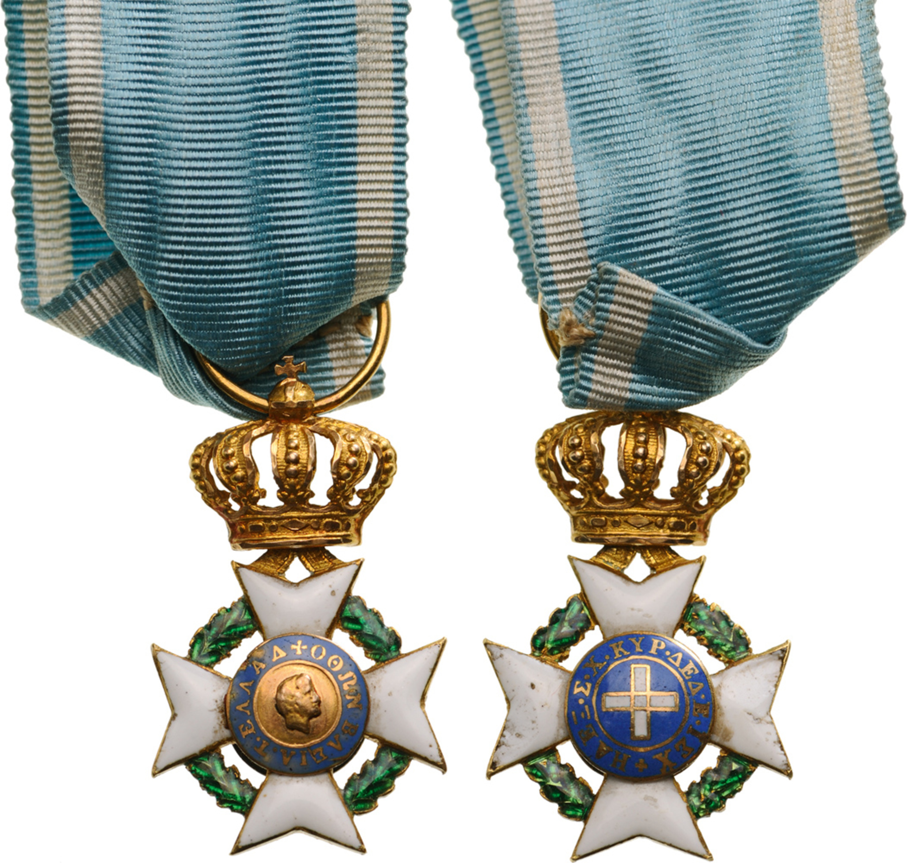1st type Knight`s Cross Miniature, 25x15 mm, in GOLD and enamels, with centre medallions in gold,with King Otto`s portrait (facing right) to the obverse and Bavarian colours to the reverse, hinged suspension crown and original ribbon. A very fine and rare piece, probably of French manufacture, very fine condition. II R!
