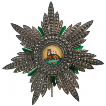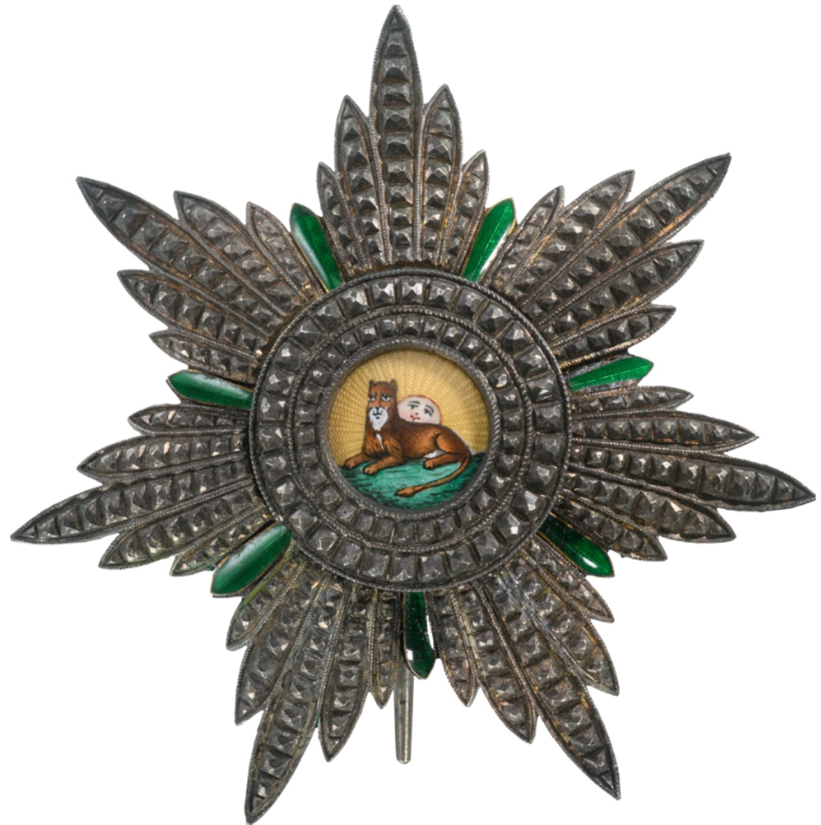 1st Class Star of the Order, Civil Class. Breast Star, 83 mm., Silver, with chiseled and pierced rays, green enameled intermediate rays, centre medallion with a very fine enameled miniature, representing the couching lion and a rising sun, thin pin and two side hooks on reverse.A superb star, in prefect condition. I