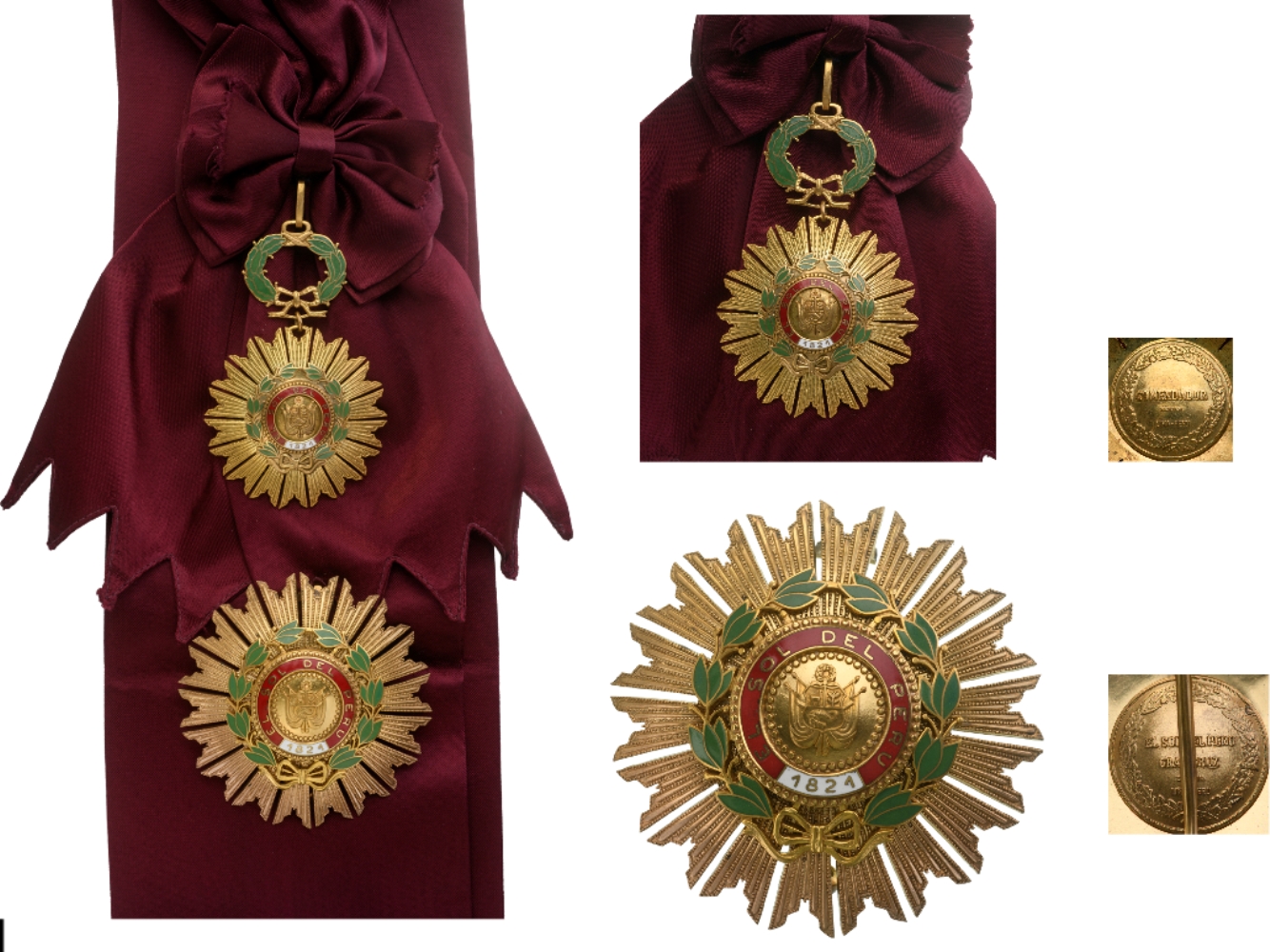 Grand Cross Set, 1st Class, instituted in 1821. Sash Badge, 89x58 mm., gilt Bronze, maker's mark "Zuloeta S.A.", one-side enameled, central medallion gilt, original suspension wreath, loop and complete sash. Breast Star, 79 mm., gilt Bronze, maker's mark "Zuloeta S.A.", with smooth rays, superimposed parts bronze gilt, enameled, large vertical pin on reverse, in original case of issue with gilt weapon in the lid. Scarce set in mint condition! I R!