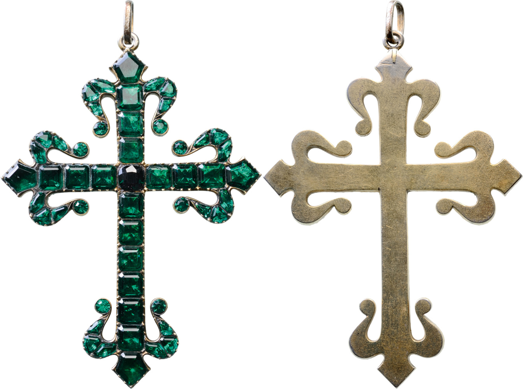 19th Century, jewelled Badge, 77x91 mm, gilt Silver, lily cross, completely set with emerald green stones, the upper arm with a tiny loop and suspension ring, smooth reverse. A highly elegant piece of this important Portuguese order, extremely fine condition. I RR!