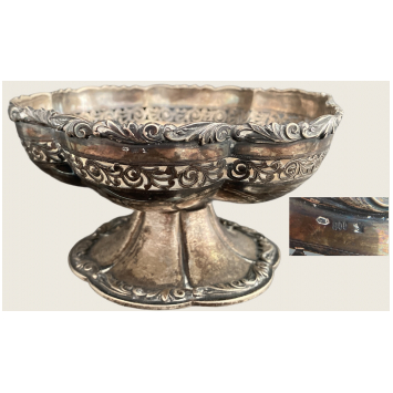 Beautiful silver fruit display cup, multi-lobed on pedestal model on pinch-side with a large openwork cut, rich frieze in relief with florer scrolls on the border. Undoubtedly Italian work at the end of the 19th century, guarantee hallmark 800. Weight 253 g, diameter 14 cm, height 6.5 cm. Good condition