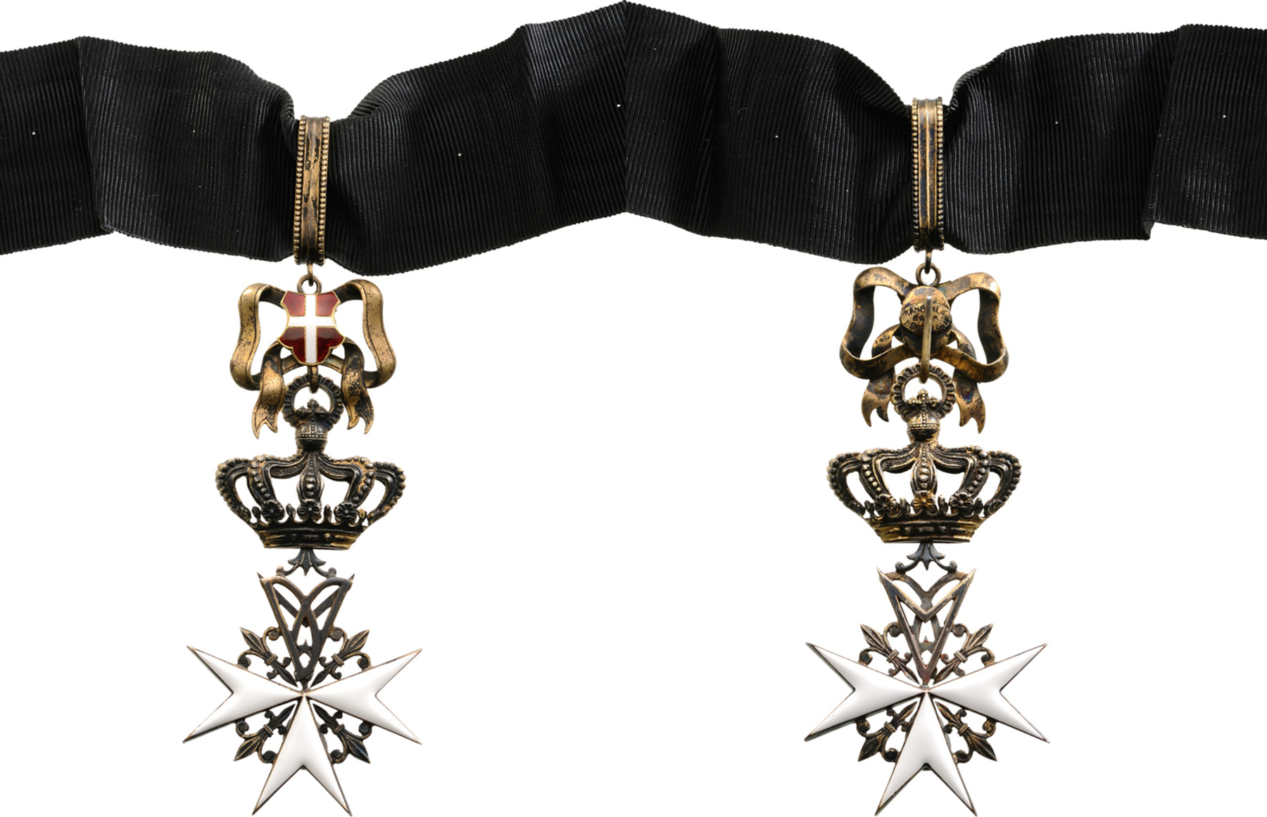 Donat Cross with Military Trophy, 1st Class. Neck Badge, 95x42 mm, gilt Silver, maker's mark "Tanfani&Bertarelli, Roma", both sides enameled, original enameled military trophy suspension device and neck ribbon. R! I