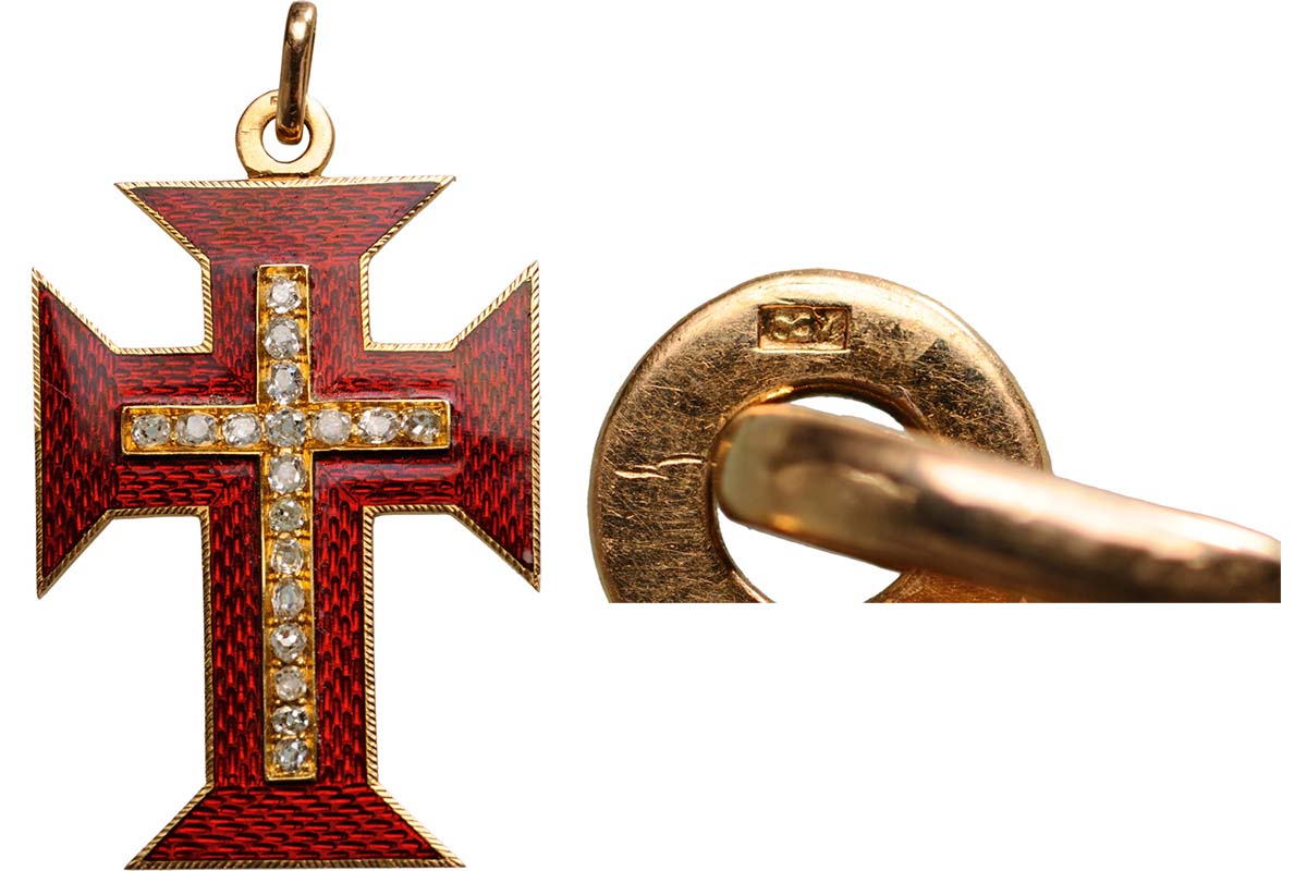 Cross of the Order in Gold and bright-red, translucent enamel to both sides, 49x32 mm, on an elegantly chiseled ground, the centre, with an applied, gold cross set with white, brilliant-cut stones, circular, upper loop (this, struck with marks on both sides) and oval suspension ring. An excellent, rare piece, mid 19th Century, almost pristine condition. with 18 diamonds fora total of 0.92 ct. I RR!