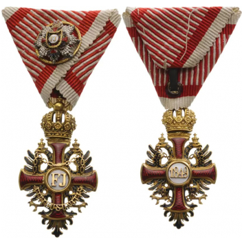 Knight’s Cross, instituted in 1849. Breast Badge, 56x31 mm, GOLD, enameled, maker’s mark “Mayer’s Söhne, Vienna” and gold marks, hinged reverse centre medallion, original war ribbon with the “Kleindekoration” of the Grand Cross with War Decoration in silver, gilt silver and enamels, this a very early, production of Rothe. A rare and beautiful piece, extremely fine condition. I R!