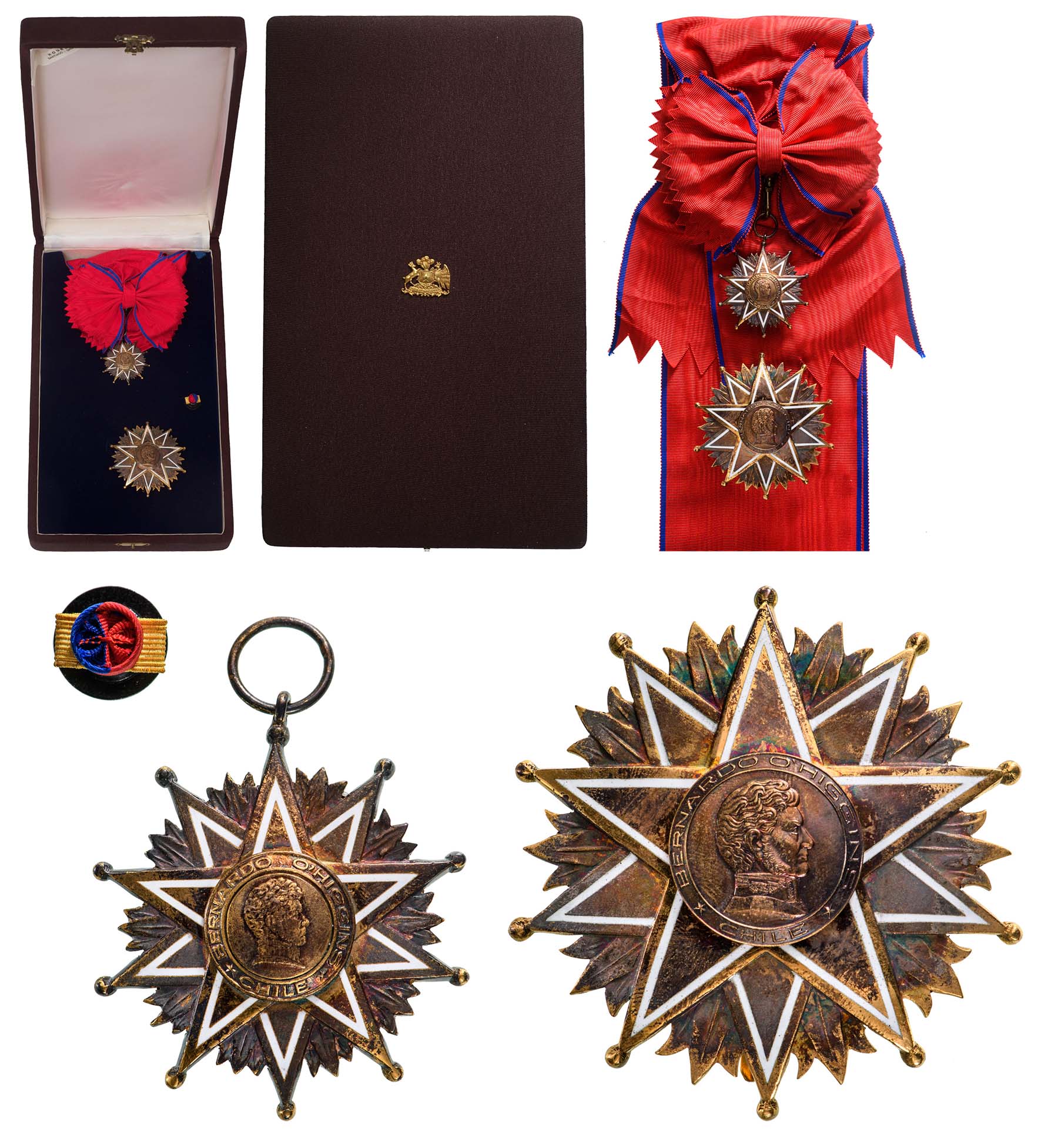Grand Cross Set, 1st Class, instituted in 1956. Sash Badge, 51x47 mm., gilt Silver, one side enameled, central medallion gilt, original suspension ring and sash. Breast Star, 72 mm., gilt Silver with smooth rays, superimposed parts gilt, enameled, large vertical pin on reverse, in original case of issue by "Hours - Santiago" with gilt weapon on the lid and rosette. Scarce set in mint condition! I R!