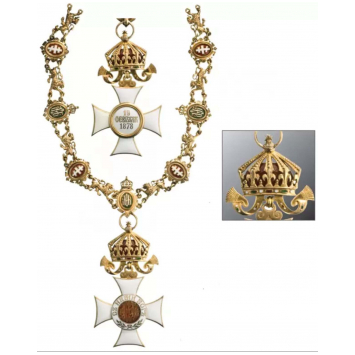 Prince size Collar of the Order. 6 side links and the central one, 90 x 47 mm., in gilt silver with alternate red and green enameled centres with white enameled patriarch crosses and royal ciphers, 8 lions passant and tenant with finely engraved reverse side, gilt silver badge of the order with white enameled arms and centre obverse circlet, red enameled medallion, the reverse centre with plain, grooved border and white enameled medallion, typical crown suspension with enameled details and inner cap. A very rare chain in almost best condition. Provenance: H.M. Ferdinand I, Tsar of Bulgaria, Sotheby`s - London, 7th of July 1998. RR! I
