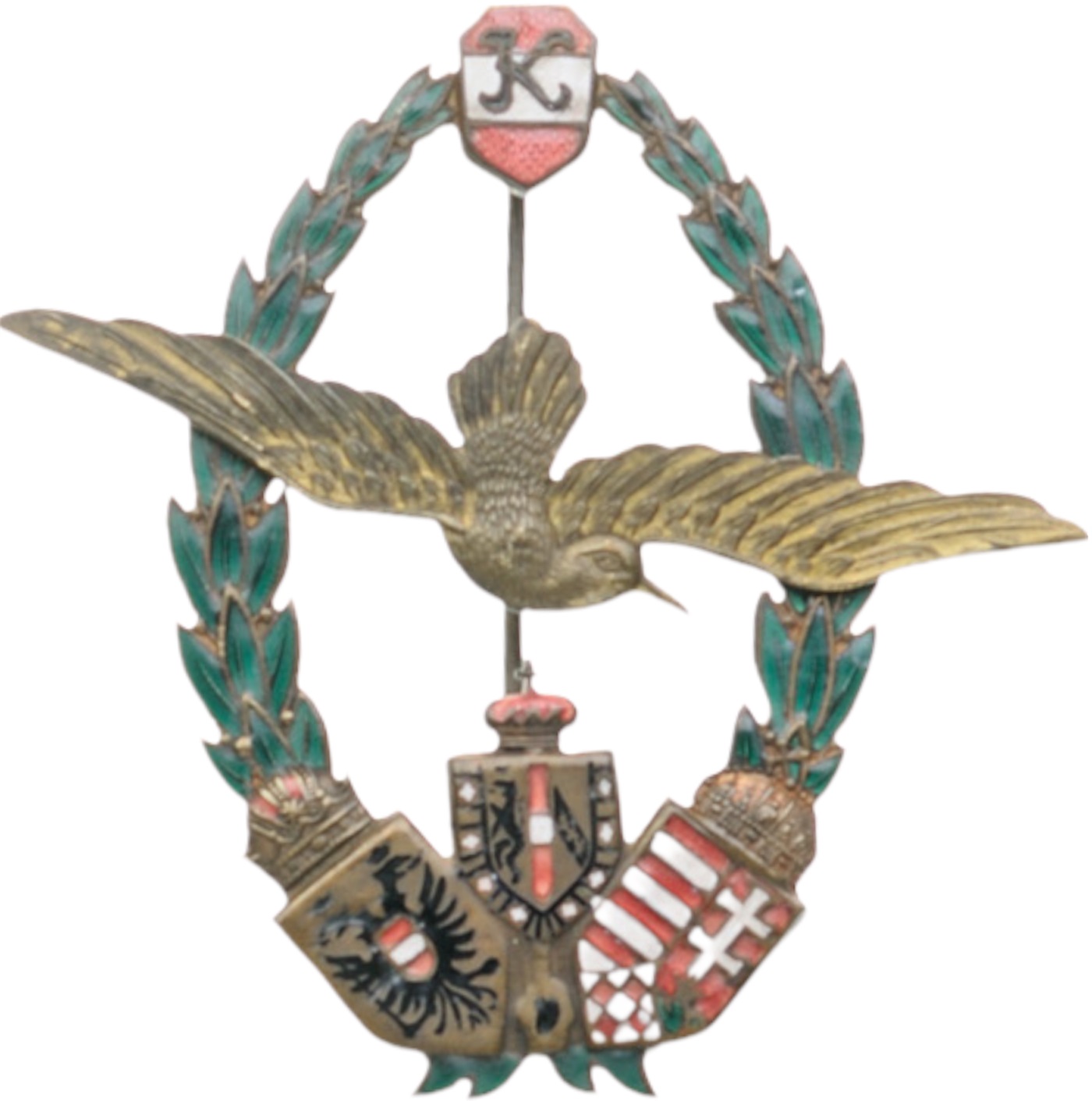 SKU: 446 Auction has finished. Total bids: 2AUSTRIABreast Badge, 67x70 mm, gilt Tombac, partially enameled, multi part construction with vertical pin on reverse. Maker`s mark "J.ZIMLER WIEN.VII". RR! I- Shop ID: GF 43Auction LVI - Day 1