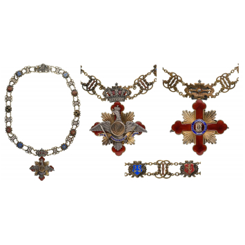 Collar Chain. Collar Badge, 88x69 mm, gilt Silver, both sides enameled, centre gold, cross and the scarf with blue enameled legend "Prin statornicie la isbinda". The Chain, 70 cm, silver gilt, oneside enameled, 22 enamelled medallions. The Order of Carol I, the highest Romanian Order, instituted on May 10th, 1906, part of the 40th jubilee celebration of King Carol of Hohenzollern, was awarded until 1932 in 4 classes: Collar, Grand Cross, Grand Officer and Commander. With the introduction of the Order of Loyal Service in 1932, the last two classes of the Order Carol I were closed, but the decorations could be worn until 1947. A superb and very rare collar, in best condition! I RR!