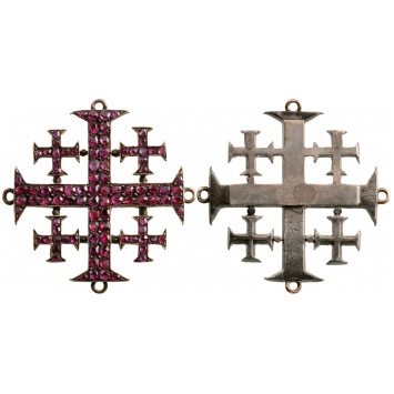 Early, Jeweled Cross of the order in Silver, 40 mm, with traces of gilding, the obverse, profusely set with rubies, four side-loops, smooth reverse.Very rare, interesting and worth of further studies. I RR!