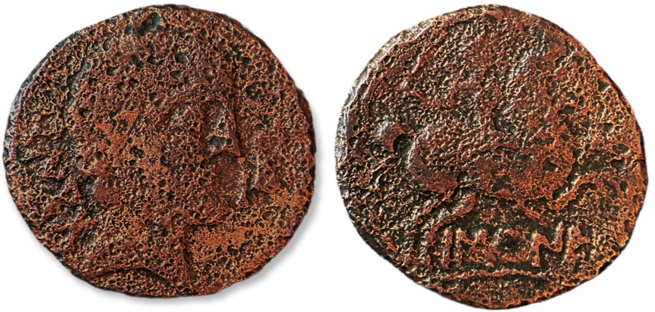 Bearded head right, dolphin upward hacia before, iberian legend BENKODA behind/ Horseman right, holding sword, Iberian legend BASKUNES below. ABH 220. F+