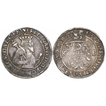 Silver, 6.4 g. Crowned decorated bust of armoured Emperor to the right, holding a scepter and a sword / Large shield with the Austrian eagle, on his chest quartered shield with Hungarian bars and double cross, Dalmatian leopard heads and Bohemian lion. Smaller shield with Austrian coat of arms in the centre of the bigger shield. Crowned Madonna and Child and scepter above the shield. Mintmark on either side, H.: 920, U.II.: 726, RR! VF, superb patina!