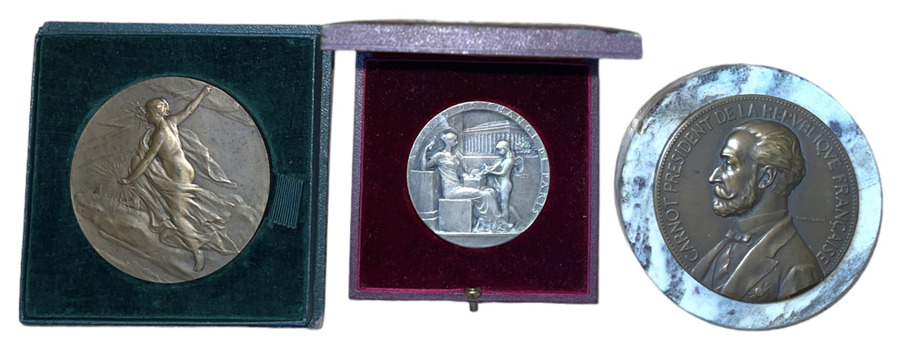 Sadi Carnot, President (1887-1894). Medal by Alphonse Dubois, 1889, Bronze, 68 mm, on marble stand (90 x 15 mm); 3rd Republic (1870-1940) AGENTS DE CHANGE DE PARIS Medal 1898, Silver (50 mm, 63.29 g), engraved "M. Bergeron" in original case of issue with recipient`s name on the lid; Prize Medal from the Electrical Constructions Syndicate N.D, Signed by Charles Pittet, Bronze (69 mm, 126.58 g), engraved for "M. Jean Guene" two in original cases of issue. UNC, interesting lot! (3)