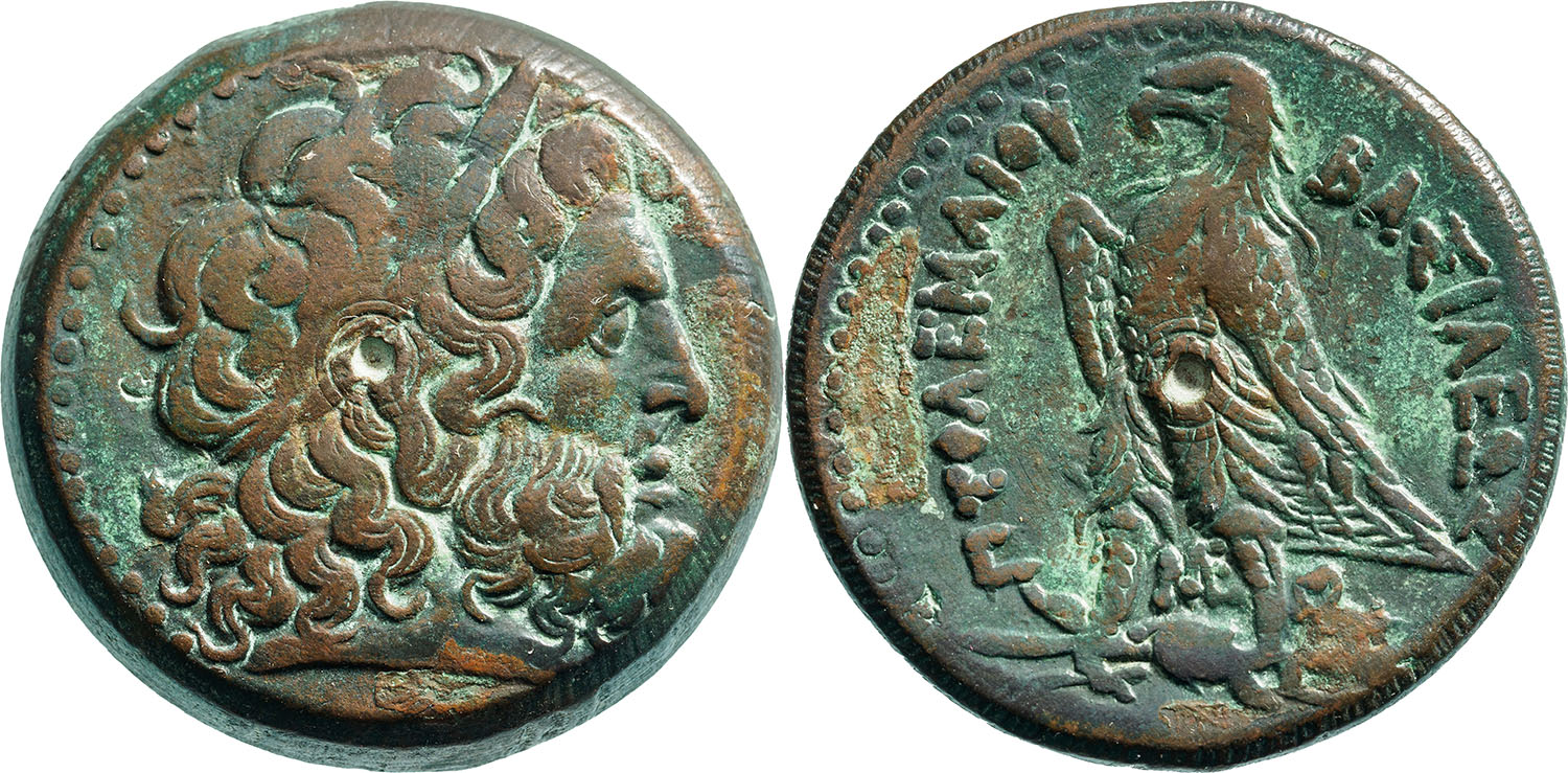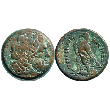 Laureate head of Zeus-Ammon to right / ΒΑΣΙΛΕΩΣ ΠΤΟΛΕΜΑΙΟΥ, eagle with closed wings standing to left on thunderbolt; ME monogram between legs, Θ beneath eagle's tail. CPE B242; Svoronos 466. VF+