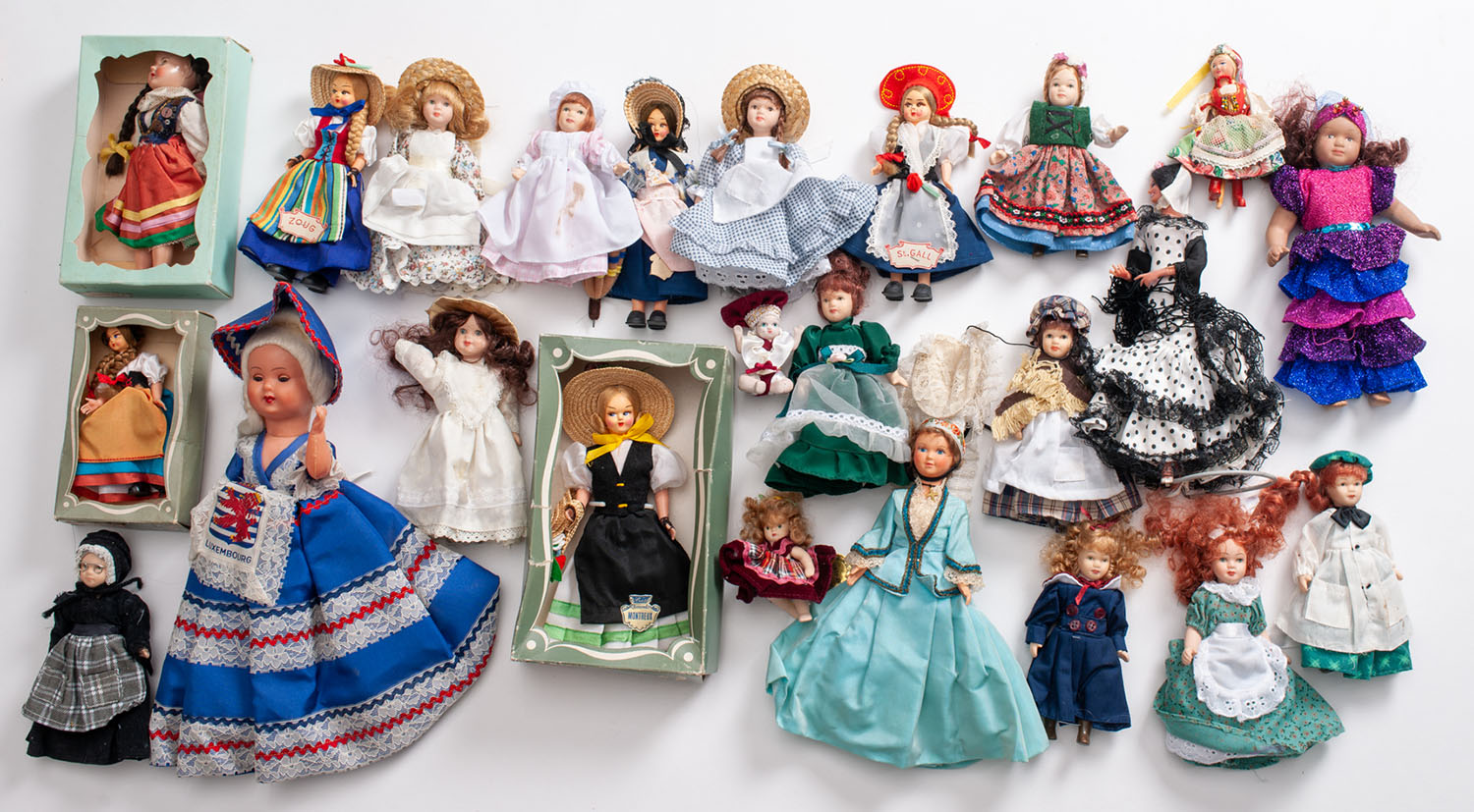 Important collection set consisting of a box of +/- 55 folk dolls, 1950s to 1980s, many regional provenances, various sizes of an average of 15 cm, bakelite, platic and composite, good condition for all. Very interesting lot!