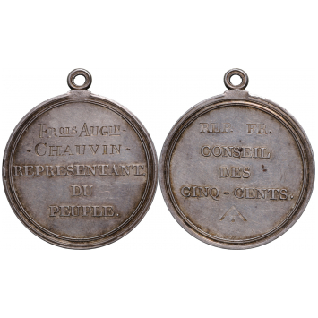 Breast Badge, instituted in 1795, by Dupre, 41 mm, Silver, original suspension ring, named to "Francois Augustin Chauvin". Very rare medal awarded to Francois, Augustin Chauvin-Hersant, 1756-1836. Very rare and in superb condition! I- RR!