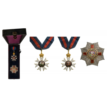 Knight Grand Cross Set. Badge of the order in GOLD, 97 x 70 mm., with white enameled arms, splendidly made image of the saints in gold, enriched by polychrome, miniature enameling, on enamel painted ground, deep-sea-blue enameled outer circlets, bearing the Order`s motto "AUSPICIUM MELIORIS AEVI" in gold lettering, chiseled and engraved, hinged, upper crown, with tubular loop and round, ribbon ring, with long, original ribbon for wear around the neck. Breast Star, 82 mm., in Silver, with chiseled and pierced rays, red enameled cross with most fine engraving, centre medallion with miniature enamel image of St. Michael defeating the devil, within deep-sea-blue enameled outer circlet, superimposed by the chiseled order`s motto, smooth reverse with vertical, golden pin, In an old, privately-made, fitted case, probably made on behalf of the owner himself, for a better storage of his awards. A beautiful, very rare and early set, extremely fine condition. I RR!