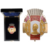 Grand Cross Badge, special division with "jewels": bust of Simon Bolivar in gold on white enameled base and a red enameled field above, with golden inscription "REPUBLICA DEL PERU" and below, a further red enameled field with golden inscription "AYACUCHO 1824", the sides, with golden laurel branches on white enamel, sided by polished gold sectors, the upper part, with beams set with brilliants, sided by golden flags and standards, set with brilliants and rubies, polished reverse with pin, in the original, large lacquer case of issue, with blue velvet, fitted inner compartment. An exceptionally rare piece, of the type awarded to heads of state and highest military personalities, excellent condition.