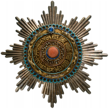 2nd Class, 2nd Grade, Star, instituted in 1882. Breast Star, 93 mm., Silver with smooth rays, central medallion Silver gilt, enameled adorned with two coral beads, reverse with thin vertical pin. A very rare and superb star, of probable German manufacture! I RR!