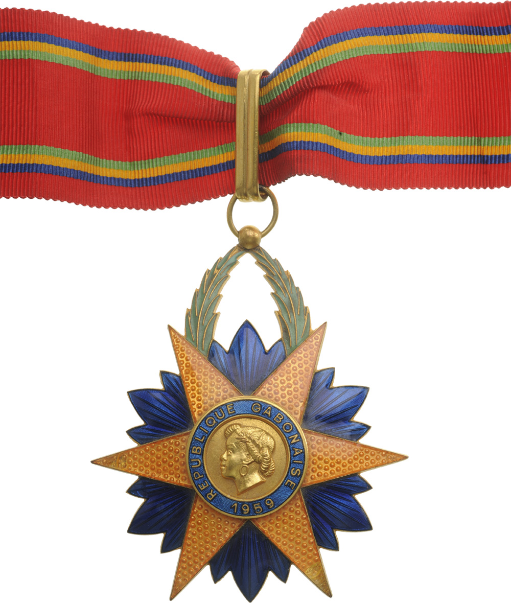 Commander's Cross, instituted in 1959. Neck Badge, 74x61 mm, gilt Silver, both sides enameled (minor damages), original suspension wreath and long complete ribbon, in case of issue by "Arthus Bertrand - Paris". Very fine condition! II
