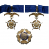 Grand Officer's Set, instituted in 1929. Neck Badge, 66x48 mm., gilt Siver, enameled, original suspension device, ring, loop and ribbon. Breast Star, 78 mm, gilt Silver with smooth rays, superimposed parts gilt, enameled (minor damage), vertical pin and two side hooks on reverse. Superb set, in very fine condition! I/II